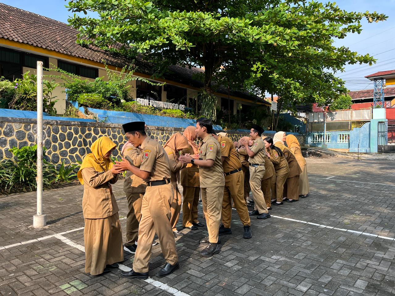 Kegiatan yang digelar di halaman sekolah tersebut diikuti oleh seluruh siswa, guru, serta tenaga kependidikan. Mereka berbaris dengan tertib untuk saling berjabat tangan sebagai bentuk saling memaafkan setelah merayakan Idulfitri bersama keluarga.
