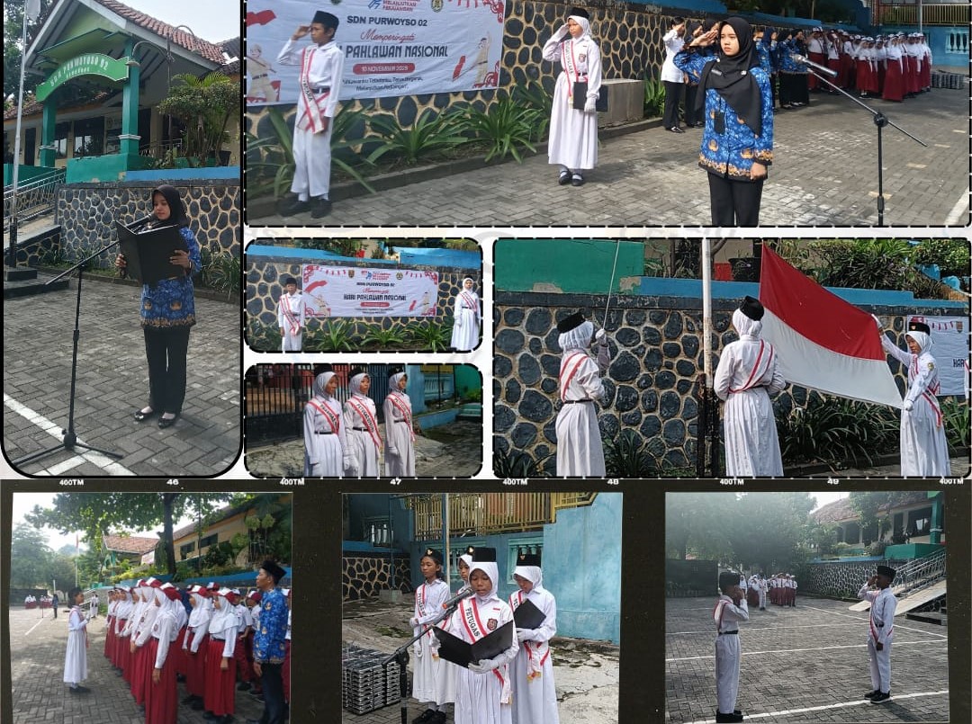 Pelaksanaan upacara Hari Pahlawan di SDN Purwoyoso 02 berlangsung khidmat. Guru kelas 1 sebagai Pembina membacakan amanat, Devi Anita Rahman,S.Pd. Seluruh peserta upacara mendengarkan dengan baik pembacaan amanat tersebut. Dalam amanat tersebut, Menteri Sosial mengajak seluruh masyarakat Indonesia untuk tetap menghargai jasa para pahlawan. Bangsa yang besar adalah bangsa yang menghargai jasa pahlawannya.